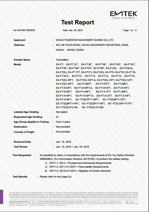 FOURSTAR tests trampoline products according to applicable safety standards to support product compliance and market entry. We conduct testing based on technical requirements defined by target markets and regulatory authorities.