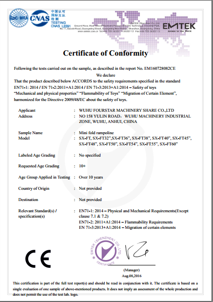 FOURSTAR maintains a structured quality and compliance system to support international trampoline markets. We test and certify our products and manufacturing processes according to safety and quality standards required by different regions. As a result, our compliance framework supports stable market access and clear regulatory alignment for global customers.